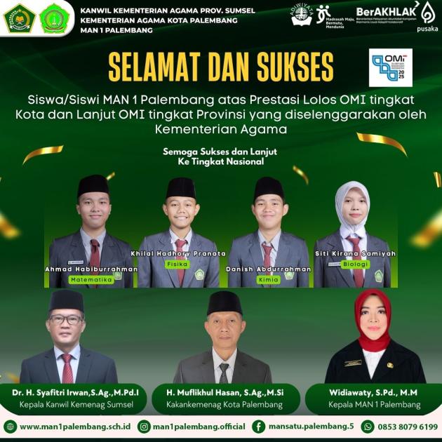 Siswa-siswi Man 1 Palembang kembali menorehkan prestasi membanggakan. Empat peserta didik berhasil lolos Olimpiade Madrasah Indonesia (OMI) tingkat kota dan akan melanjutkan perjuangan ke tingkat provinsi yang diselenggarakan oleh Kementerian Agama.(Jumat 19/09).